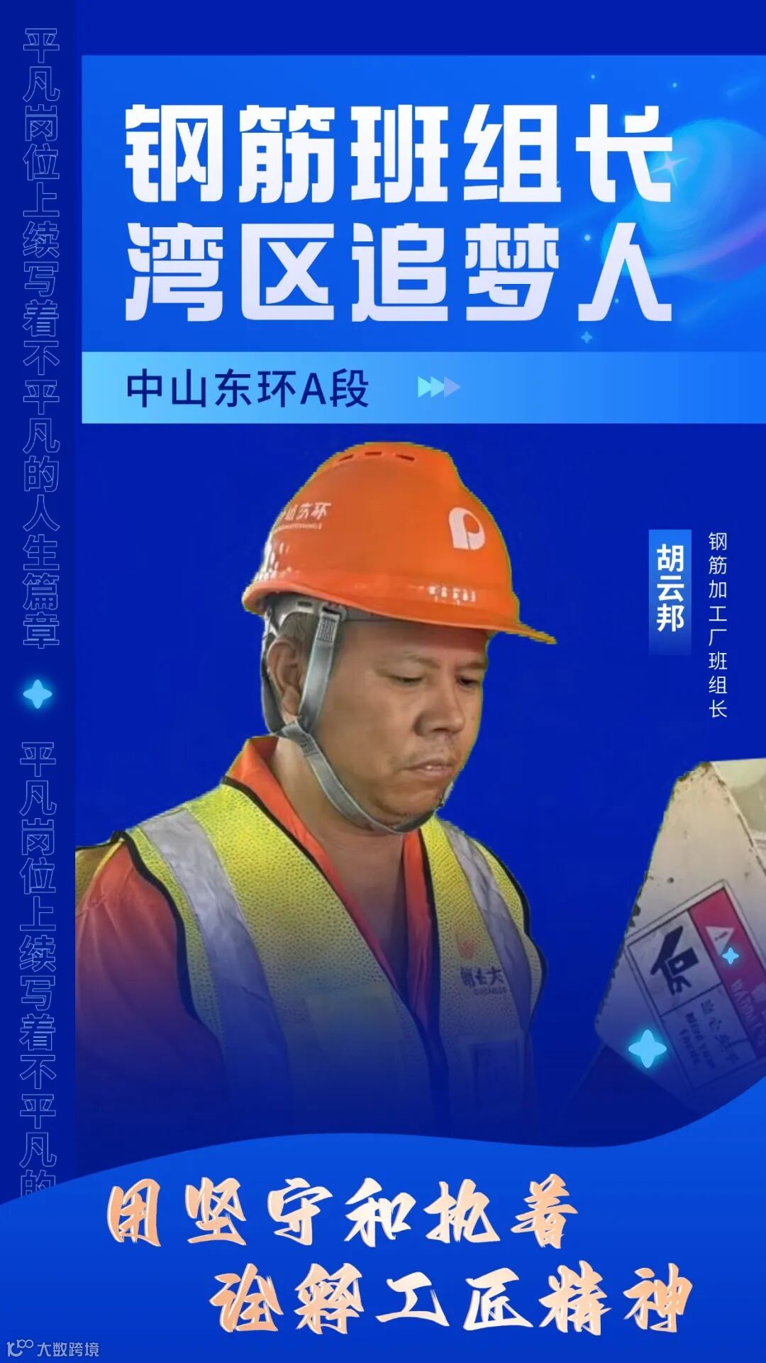 在中山东环A段钢筋加工厂繁忙的生产一线,总能看到一个忙碌而沉稳的身影,他时而紧盯生产线运行状况,时而耐心指导组员操作要领,时而仔细检查设备安全状态。他就是钢筋加工厂班组长胡云邦,一位以卓越的协调能力、严谨的安全管理意识和公正合理的任务分配,赢得领导信任与同事敬佩的优秀工人。