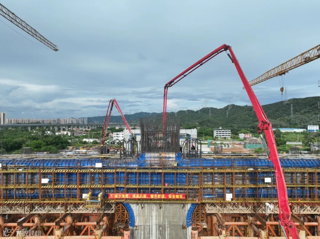 本次下横梁施工需累计浇筑混凝土1598立方米,对原材料温度控制、浇筑速度、振捣工艺及后期养护提出了苛刻要求。项目团队成立专班小组,多次召开专题讨论会,围绕施工工艺、混凝土配合比设计优化等开展研究,最终确定了“分层分段、对称浇筑”的工艺,有效分散了混凝土水化热峰值,降低了温度裂缝风险,确保了下横梁支架受力均匀,避免了因不对称荷载导致的结构偏移,实现分毫不差的浇筑精度。