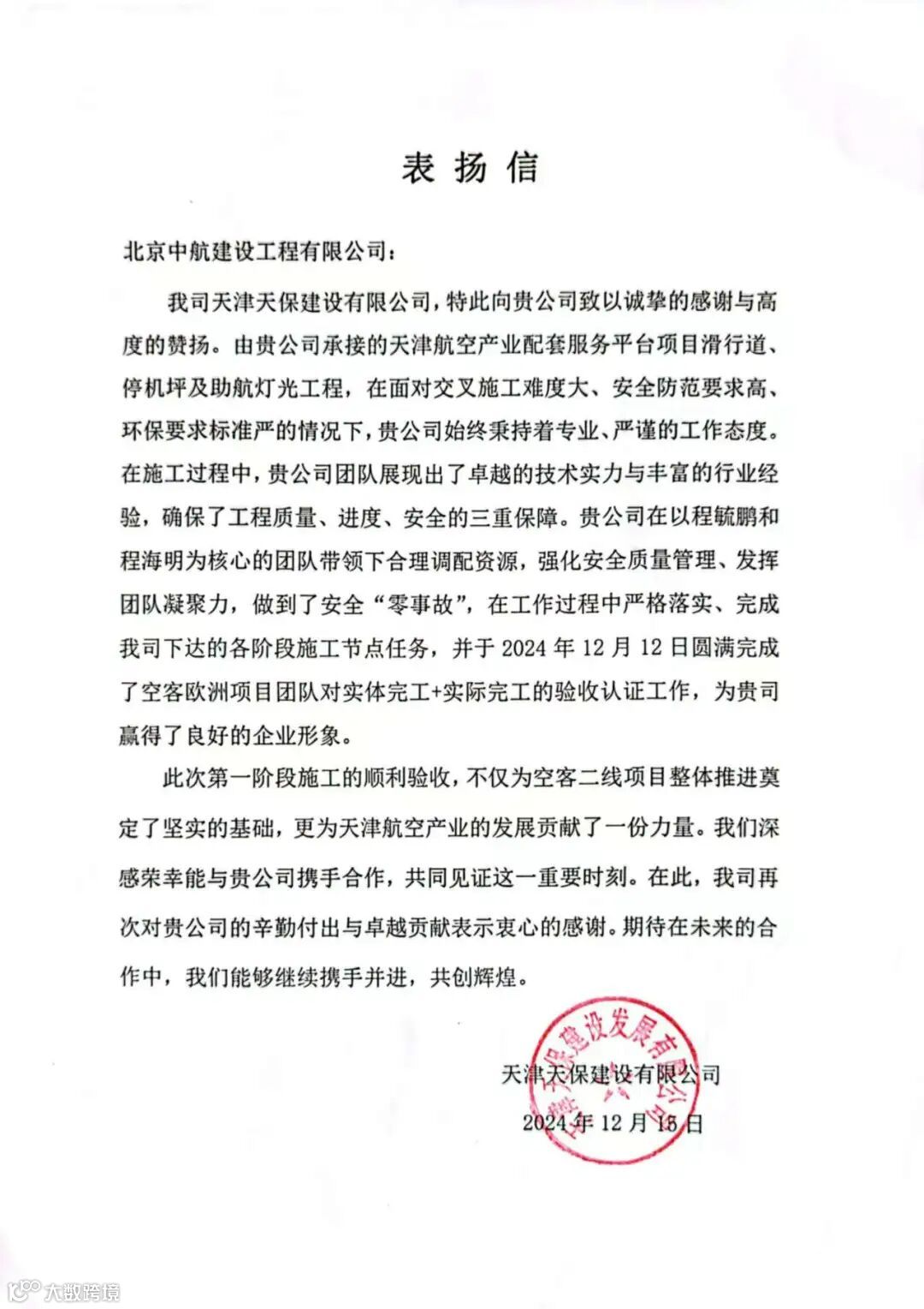 天津航空产业配套服务平台项目坚持合理调配资源,强化安全质量管理、发挥团队凝聚力,做到了安全“零事故”,于2024年12月12日圆满完成了空客欧洲项目团队对实体完工+实际完工的验收认证工作,为空客二线项目整体推进奠定了坚实基础。
