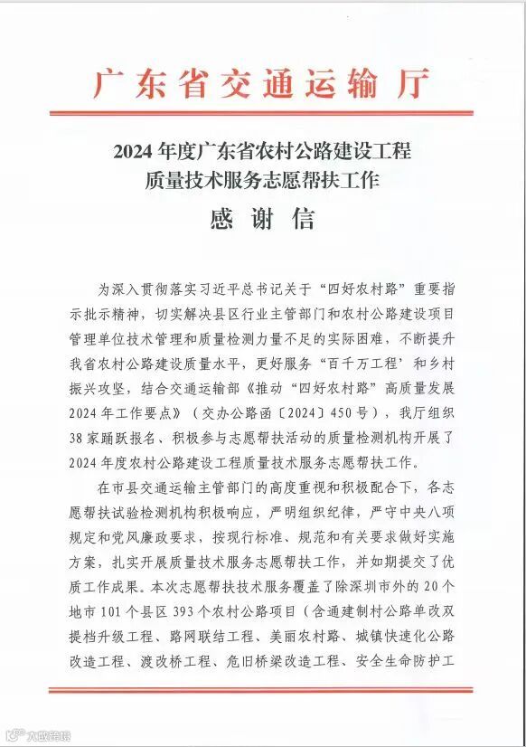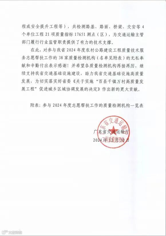 长大检测公司积极参与广东省农村公路建设工程质量技术服务志愿帮扶工作,组织技术团队赴珠海市定点开展农村公路质量帮扶检测与技术培训活动,2024年帮扶检测桥梁2座,道路3条,共计7.8公里,如期提交了优质的工作成果,助力百千万工程建设。