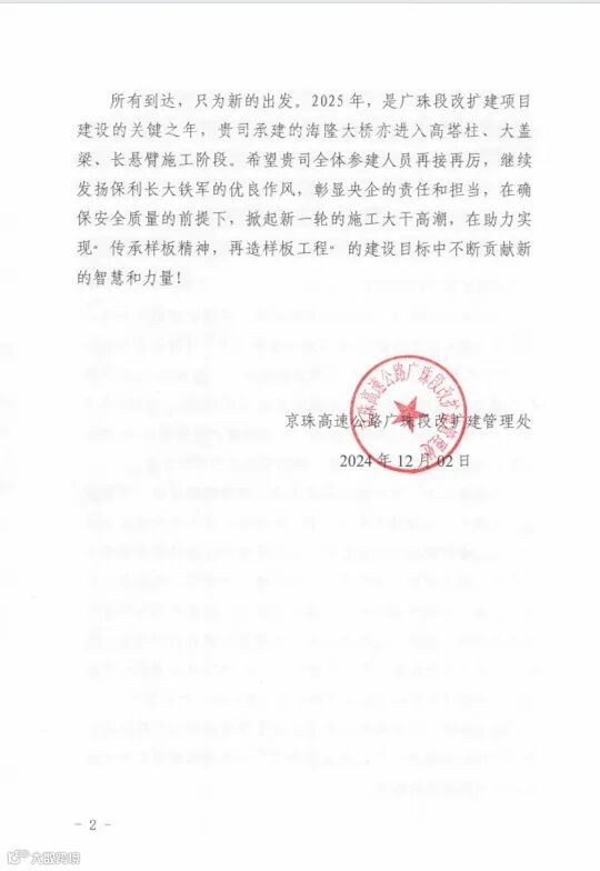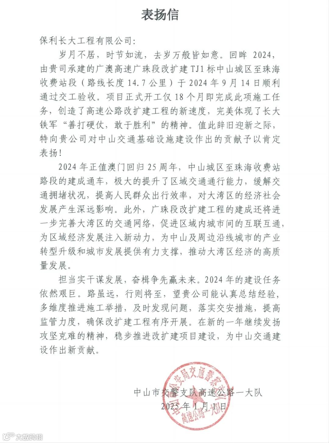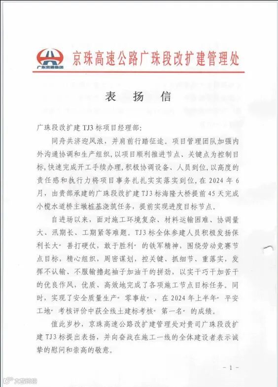 广珠段改扩建TJ1标在承建中山城区至珠海收费站14.7公里路段施工中,仅用时18个月实现完工、通过交工验收,通车后区域交通拥堵缓解,居民出行效率提升;优质高效完成“三改工程”,助力提前实现广澳高速南朗段的通车,为当地居民交通出行带来了显著改善。