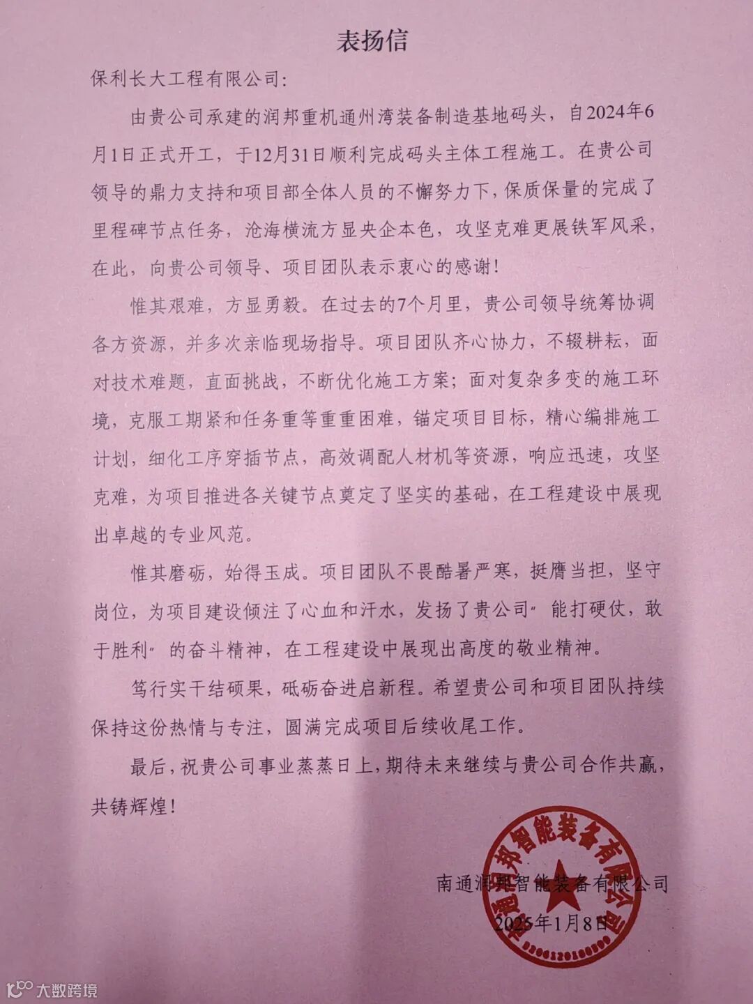 江苏润邦重机通州湾装备制造基地码头自2024年6月正式开工,同年12月顺利完成码头主体工程施工,历时7个月保质保量地完成了里程碑节点任务。