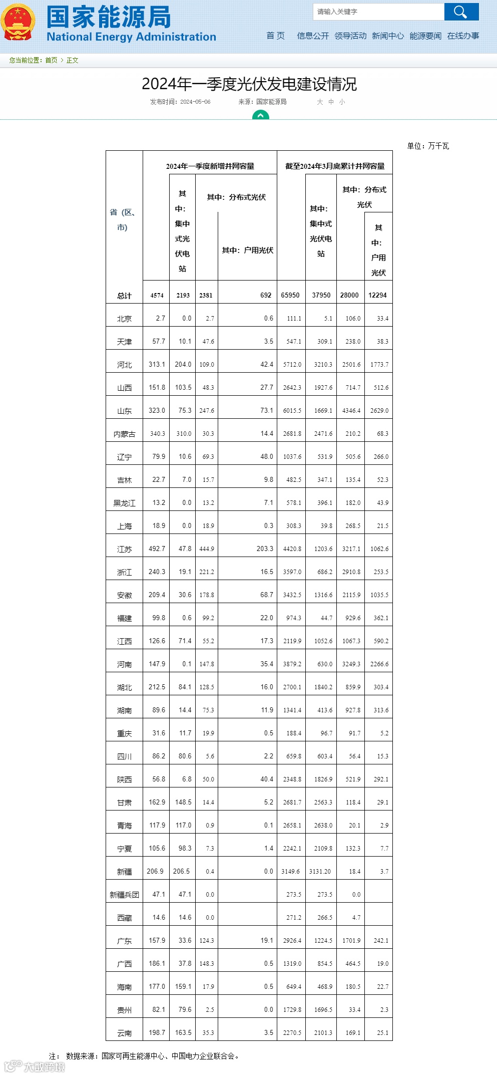 5月6日晚间,国家能源局披露的2024年一季度光伏发电建设情况显示,一季度新增并网容量4574万千瓦,其中集中式光伏电站2193万千瓦,分布式光伏2381万千瓦。