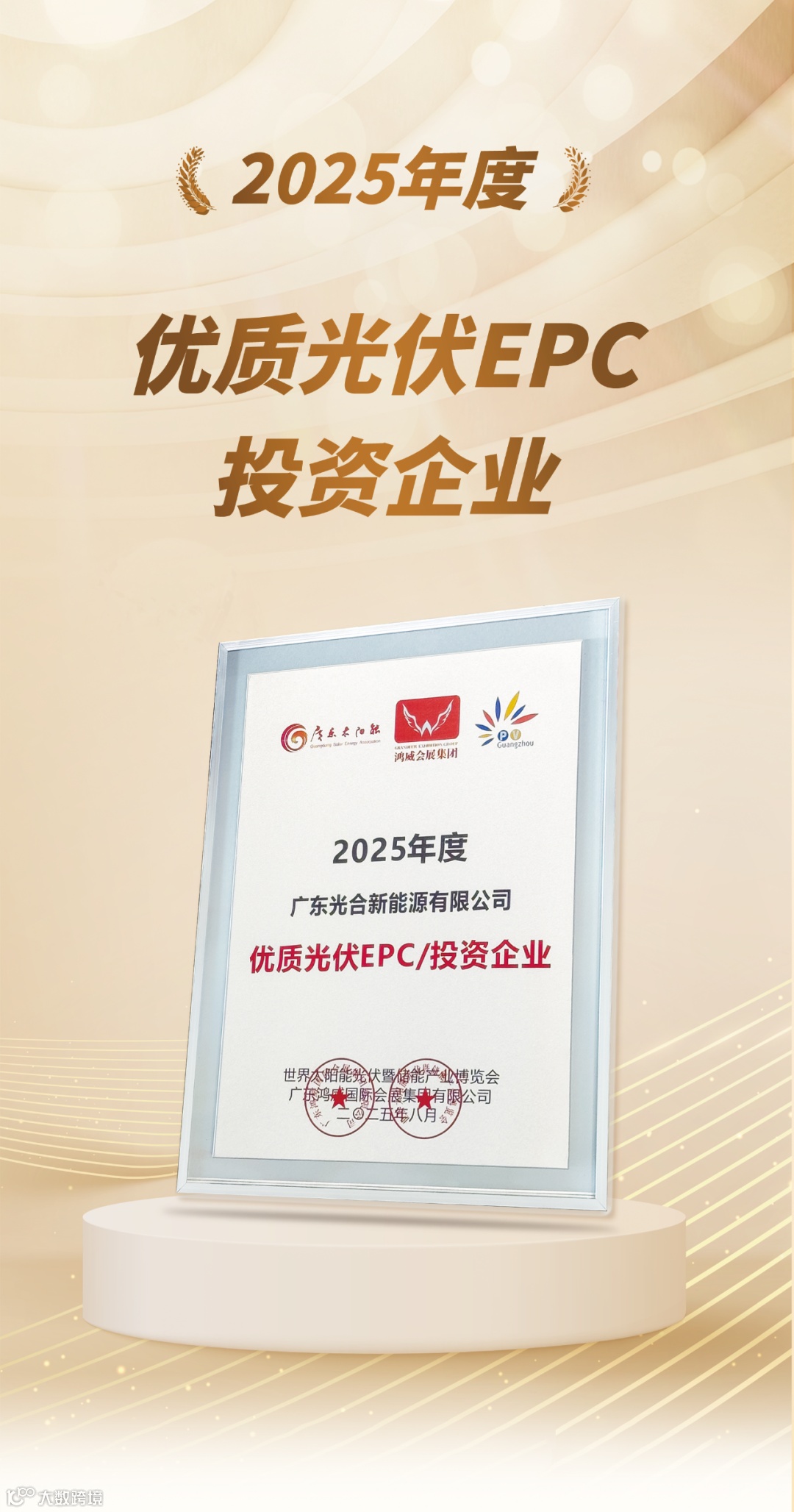 广东光合能源有限公司凭借其在光伏领域完善的售后服务体系及专业的技术团队,荣膺"2025年度优质光伏EPC/投资企业"荣誉称号。