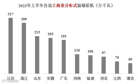 2023年上半年工商业分布式光伏装机规模为1944万千瓦,前三的省份分别为:江苏、浙江、山东;前十省份合计1656万千瓦,占到全国新增光伏装机的85%。新增光伏总装机前十省份的具体情况如下图所示。