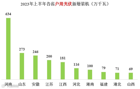 2023年上半年户用装机规模为2152万千瓦,前三的省份分别为:河南、山东、河北;前十省份合计1969万千瓦,占到全国新增光伏装机的91%。新增光伏总装机前十省份的具体情况如下图所示。