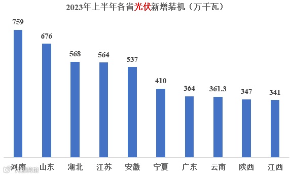 2023年上半年总装机为7842万千瓦,前三的省份分别为:河南、山东、湖北;前十省份合计4927万千瓦,占到全国新增光伏装机的63%。新增光伏总装机前十省份的具体情况如下图所示。