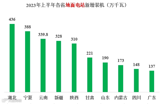 2023年上半年地面电站装机3746万千瓦,前三的省份分别为:湖北、宁夏、云南;前十省份合计2672万千瓦,占到全国新增光伏装机的71%。新增光伏总装机前十省份的具体情况如下图所示。