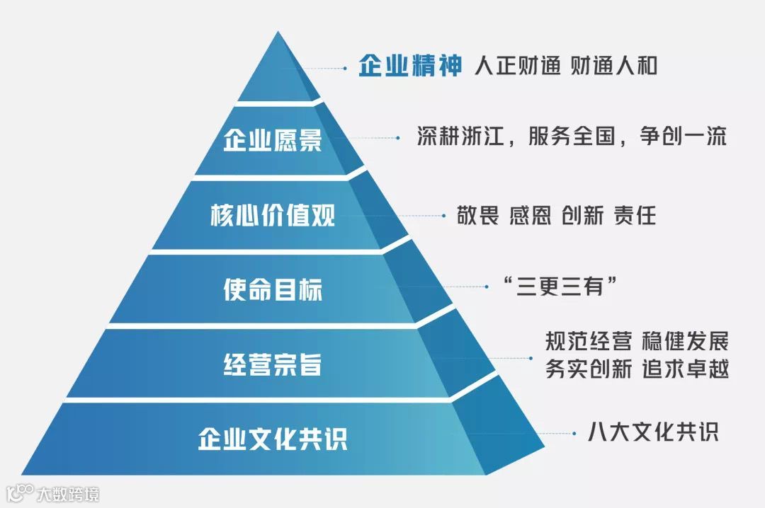 财通文化分三个层次,回答了“我是谁”“到哪里去”“如何走”三个问题。第一层是核心理念,回答了“我是谁”的问题,明确了财通是一家什么样的企业,包括“人正财通、财通人和”的企业精神、“敬畏、感恩、创新、责任”的核心价值观、“服务文化、合规文化、争先文化、和谐文化”的文化内涵。第二层是战略理念,回答了“到哪里去”的问题,明确了财通存在的目的、意义、价值和目标,包括“深耕浙江,服务全国,争创一流”的企业愿景和“三更三有”的使命目标。第三层是应用理念,回答了“如何走”的问题,明确了财通的行为准则,包括“规范经营、稳健发展、务实创新、追求卓越”的经营理念和八大财通文化共识。