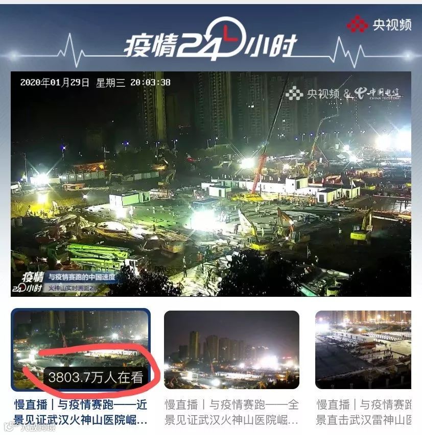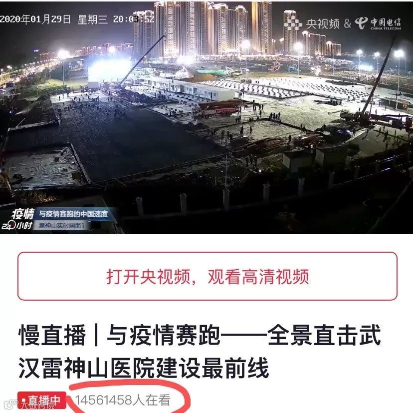 这两场直播,是27日晚央视频开通的火神山医院和雷神山医院建造过程的“慢直播”。每座医院都有近景、全景两个镜头,共4个镜头的24小时施工现场直播。没想到开播之后广受关注,随时点进去观看人数都是千万级。