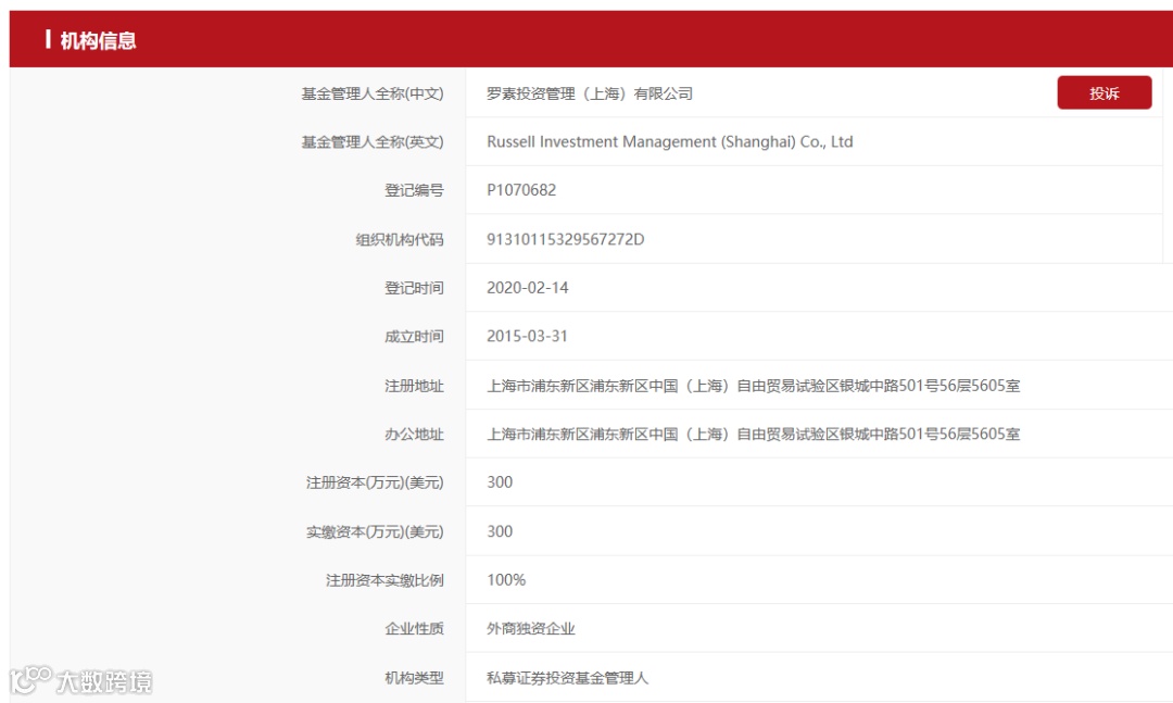 中国基金业协会网站显示,罗素投资管理(上海)有限公司成立于2015年3月31日,在2020年2月14日完成协会登记。公司的注册地址位于上海市浦东新区中国(上海)自由贸易试验区,注册资本为300万美元,全额实缴。