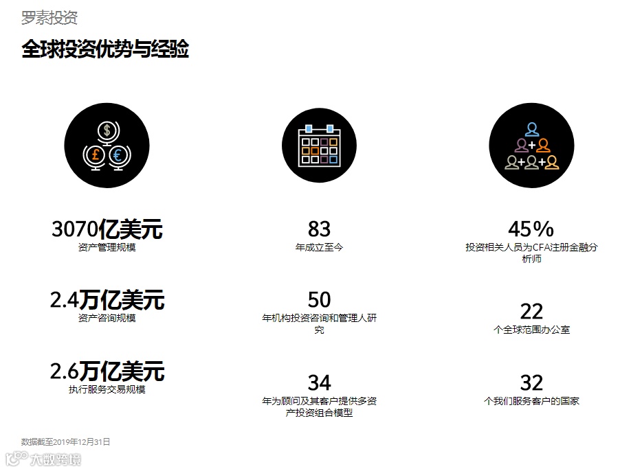 据罗素投资官网介绍,罗素投资成立至今已有83年的历史,在全球范围拥有22家办公室,所服务的客户遍布全球32个国家。截至2019年底,公司资产管理规模总额达到3070亿美元,资产咨询规模达2.4万亿美元,执行服务交易规模达到2.6万亿美元。