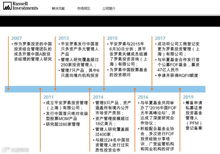 该公司官网显示,罗素投资在2007年就启动了中国投资组合管理团队对中国A股投资经历的管理人研究。2011年,平安罗素投资管理(上海)有限公司成立,并发行了中国首只绝对收益型股票MOM产品,平安罗素在2015年分拆,原关键成员组建了罗素投资咨询(上海)有限公司,为罗素中国股票基金提供投资顾问业务。