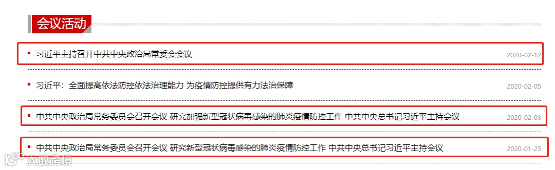 据新华社消息,1月25日,中共中央政治局常务委员会召开会议,首次聚焦新型冠状病毒感染的肺炎疫情;2月3日,中共中央政治局常务委员会再次召开会议,听取中央应对新型冠状病毒感染肺炎疫情工作领导小组和有关部门关于疫情防控工作情况的汇报,研究下一步疫情防控工作。2月12日,中共中央政治局常务委员会第三次召开会议,听取中央应对新型冠状病毒感染肺炎疫情工作领导小组汇报,分析当前新冠肺炎疫情形势,研究加强疫情防控工作。