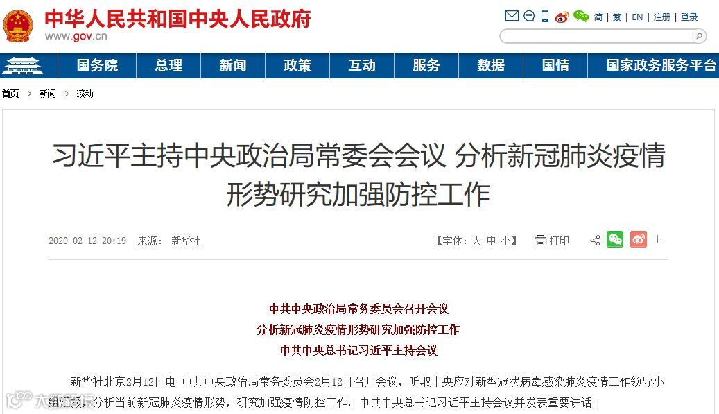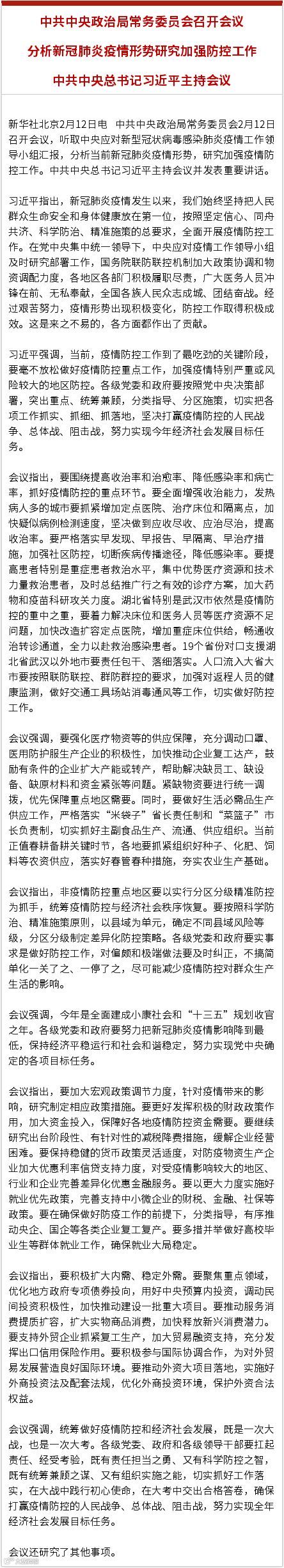 据新华社报道,中共中央政治局常务委员会2月12日召开会议,听取中央应对新型冠状病毒感染肺炎疫情工作领导小组汇报,分析当前新冠肺炎疫情形势,研究加强疫情防控工作。中共中央总书记习近平主持会议并发表重要讲话。