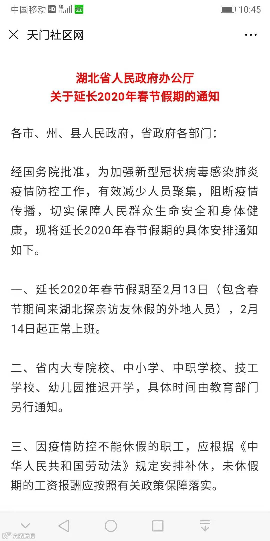 2月5日,湖北市官网发布最新消息,“湖北延长春节假期至2月13日,14日起开始上班!”通知进一步说明,包含春节期间来湖北探亲访友的外省人员,2月14日均可离开。