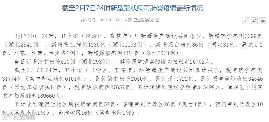 据国家卫健委统计,2月7日0—24时,31个省(自治区、直辖市)和新疆生产建设兵团报告,新增确诊病例3399例(湖北2841例),新增重症病例1280例(湖北1193例),新增死亡病例86例(湖北81例,黑龙江2例,北京、河南、甘肃各1例),新增疑似病例4214例(湖北2073例)。
