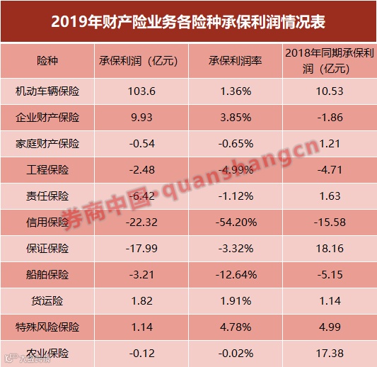从不同险种2019年业务表现看,车险、企财险、货运险、特殊风险保险等为承保盈利,信用保险、保证保险、意外险、船舶保险等其他险种均出现承保亏损。