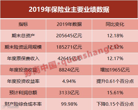 2019年底,保险资金运用余额为185270.58亿元,较年初增长12.92%。全年资金运用收益共计8824.13亿元,资金运用平均收益率为4.94%。