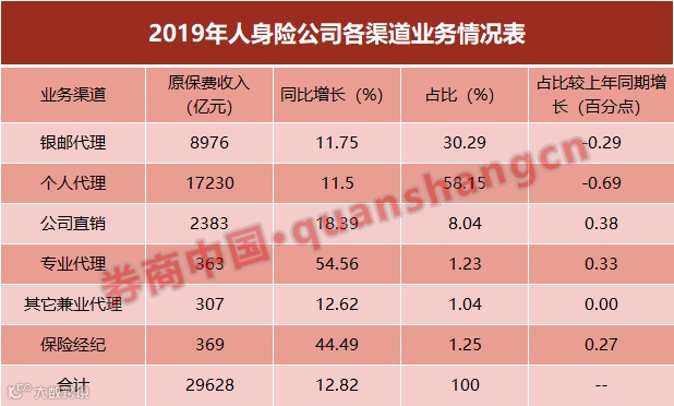 银行渠道保费约8976亿元,增长11.75%,渠道中的占比为30.29%。