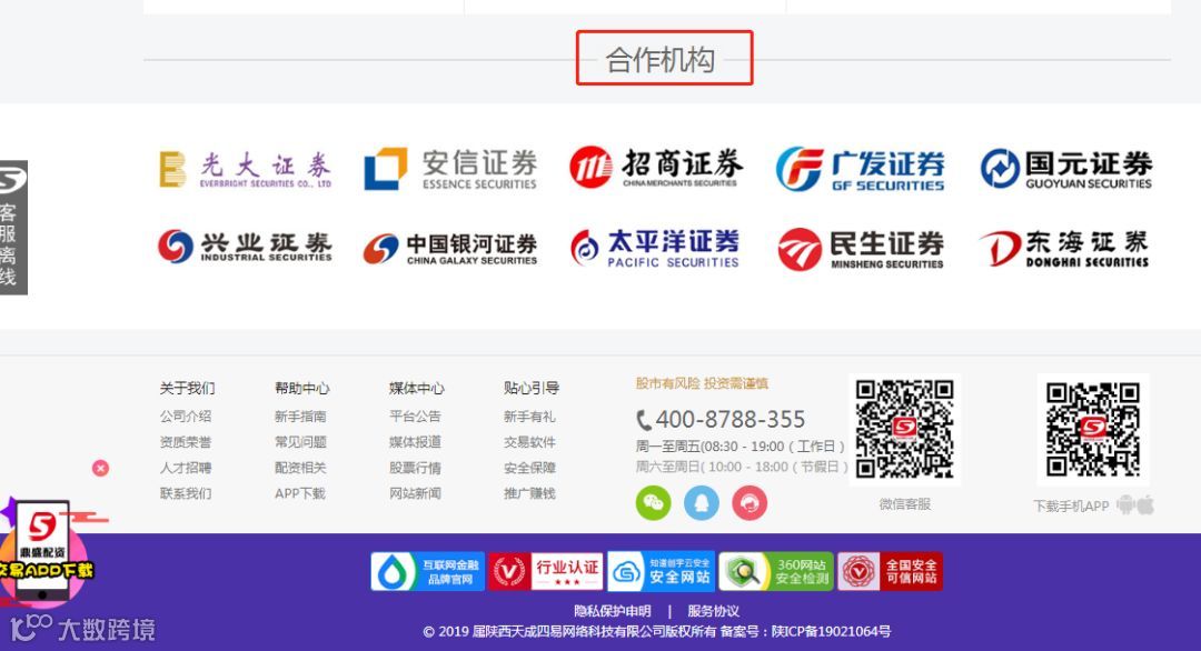 事实上,尽管场外配资已经被监管机构明确为非法行为,但仍有平台假借券商等金融机构的名义,把自己包装地体体面面。例如一家名为“鼎盛配资”的线上平台就公然将光大、安信、招商、广发等10家证券公司列入“合作机构”名单,并在网站上标注了“知道创宇云安全安全网站”、“360网站安全检测”、“全国安全可信网站”等字样。