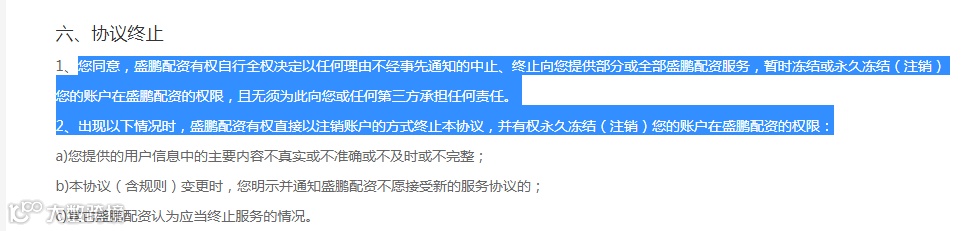 2、平台有权自行全权决定以任何理由、不经事先通知中止、终止提供部分或全部配资服务,暂时冻结或永久冻结(注销)用户账户权限,且无须为此向用户或任何第三方承担任何责任。