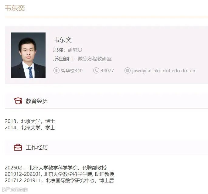 韦东奕求学生涯均在北大度过。2017年12月至2019年11月,任北京国际数学研究中心博士后。2019年12月起,任北京大学助理教授。