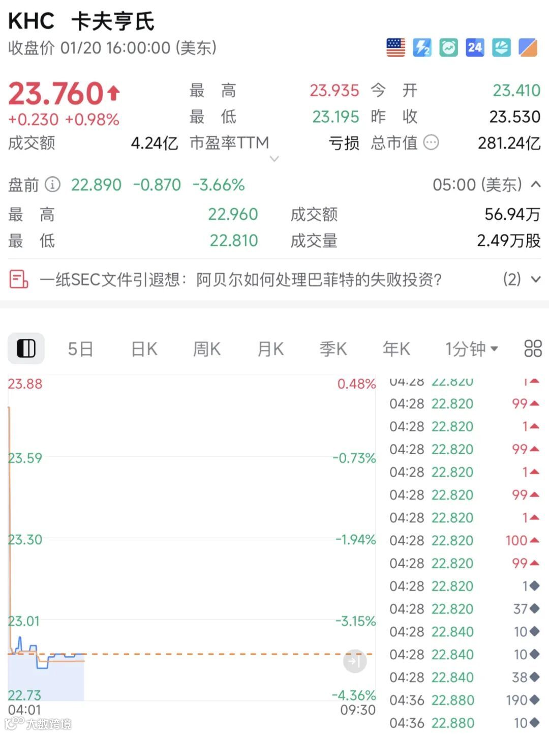 受此影响,在美股周三盘前交易中,卡夫亨氏股价大幅跳水,截至北京时间18:10,大跌3.66%。
