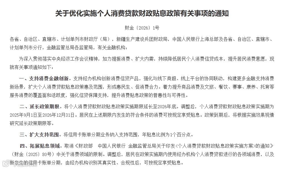 1月20日,财政部、央行和金融监管总局发布通知,对个人消费贷款财政贴息政策进行优化调整。该政策实施期限将延长至2026年12月31日,并在支持范围、领域和额度等方面做出重要调整。