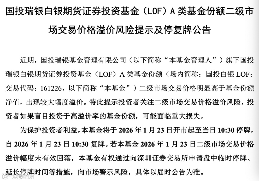 由于溢价率居高不下,在1月22日全天停牌后,国投白银LOF于1月22日晚间继续宣布暂停场内交易,将于2026年1月23日开市起至当日10:30停牌。
