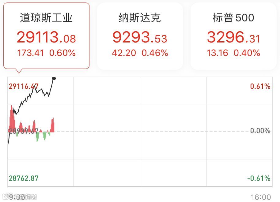 受消息面影响,美股普遍上扬,三大股指涨幅扩大,道指、标普500指数刷新历史高位,截至券商中国记者发稿,道指涨0.60%,标普500指数涨0.40%,纳指涨0.46%。