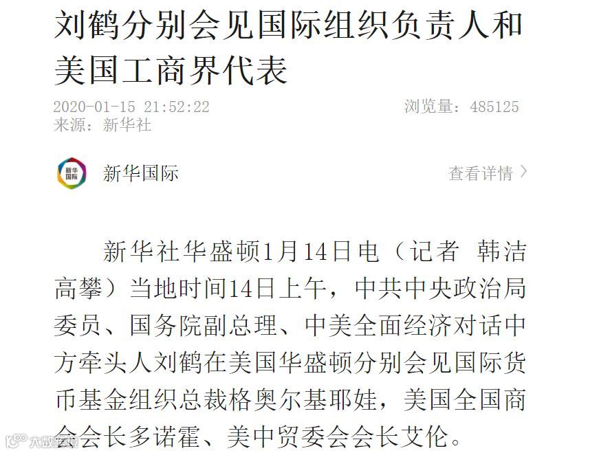 刘鹤在华盛顿会见了格奥尔基耶娃和多诺霍、艾伦。刘鹤表示,中美双方在平等和相互尊重的基础上,达成第一阶段经贸协议,并将于明天正式签署。中美作为两个负责任的大国,尽管具有不同意识形态和不同的政治、经济模式,但完全可以合作,实现互利共赢发展。