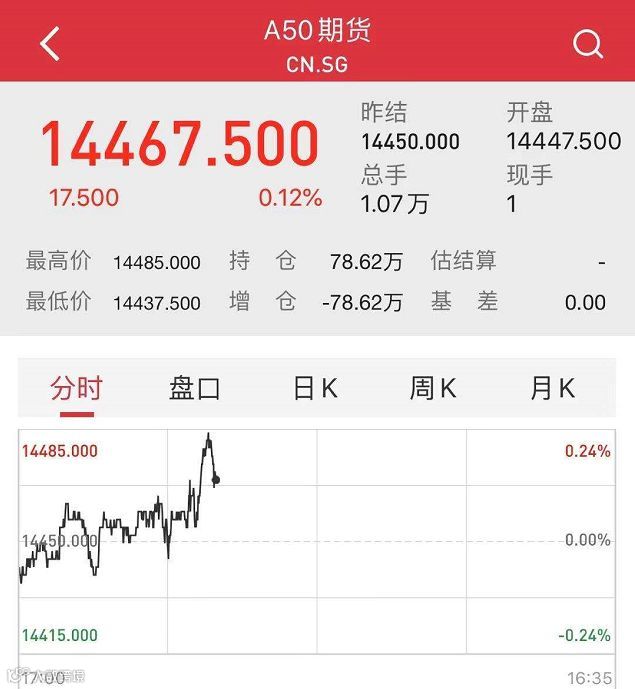 A50期货盘中有所拉升,但临近券商中国发稿,涨幅有所收窄。