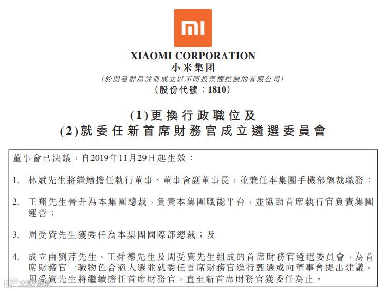 在此之前,去年11月29日,小米管理层出现大调整。其中,Redmi品牌总经理卢伟冰出任中国区总裁,集团CFO周受资出任国际部总裁,联合创始人黎万强离职,高级副总裁祁燕正式退休,林斌担任集团副董事长,王翔晋升集团总裁,何勇晋升集团副总裁。一系列调整之下,小米集团2020年将整体呈现“新官上任三把火”。