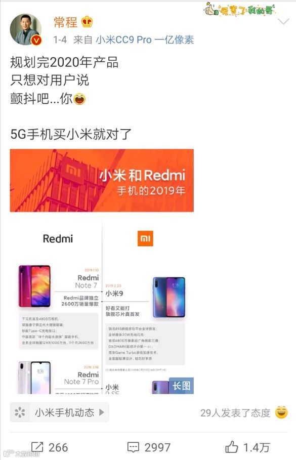 随后,1月4日,常程也在微博上高调官宣,声称已规划完2020年产品。双方一唱一和之下,令业内对小米集团的2020年充满期待。