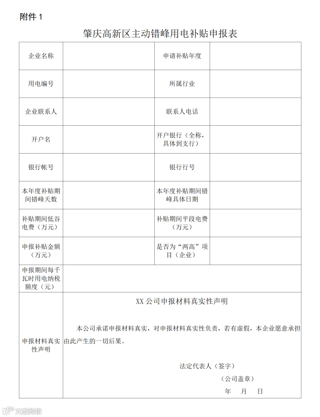 附件1:肇庆高新区主动错峰用电补贴申报表.doc