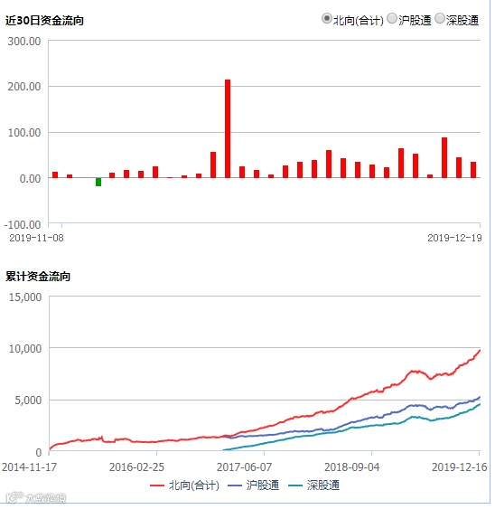 截至12月19日收盘,北向资金合计净流入35.35亿元,其中,沪股通净流入20.82亿元,深股通净流入14.53亿元。值得注意的是,这已经是北向资金连续26个交易日实现净流入,合计达991.22亿元。
