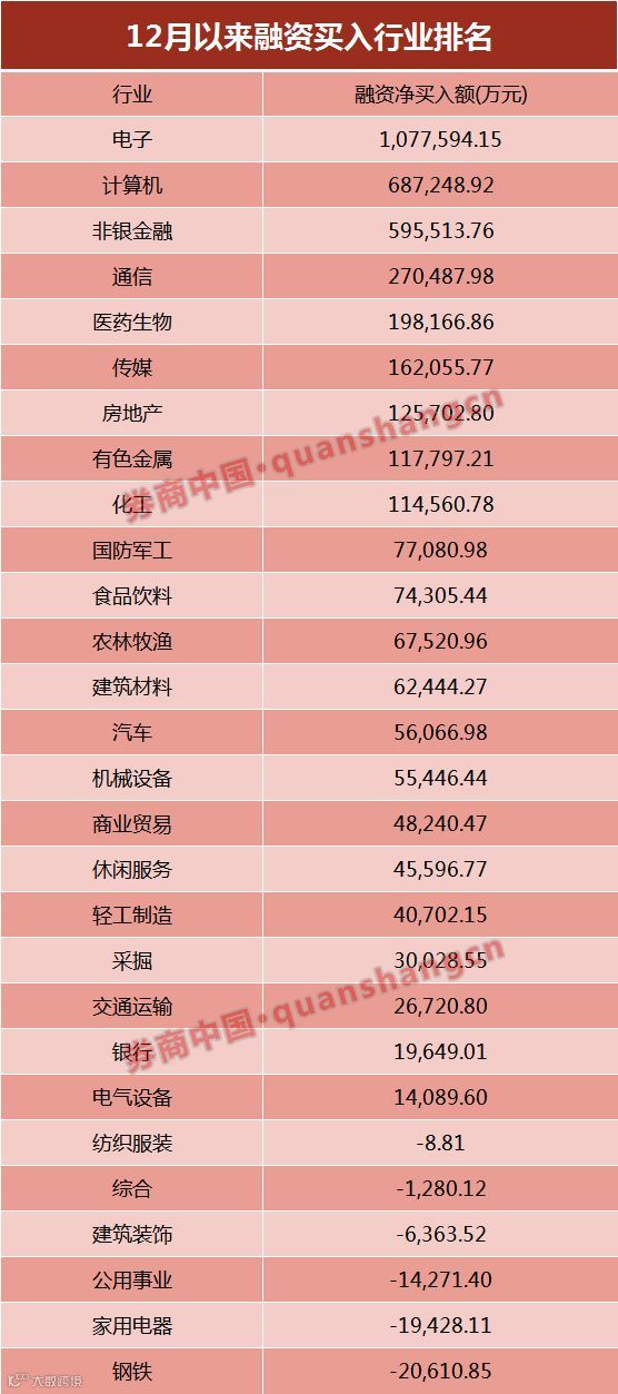 如果将时间拉长至12月以来,融资净买入最多的行业依然是电子、计算机、非银金融、通信和医药生物,分别达到107.76亿元、68.72亿元、59.55亿元、27.05亿元、19.82亿元。