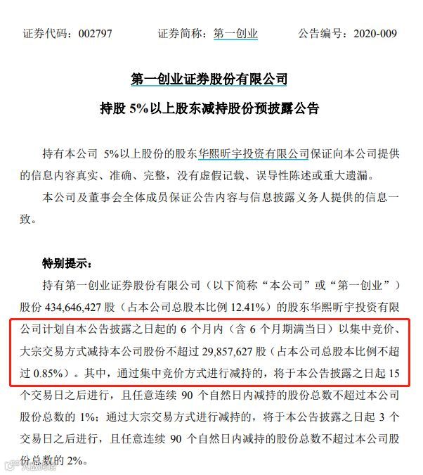 1月15日晚间公告显示,华熙昕宇目前持有第一创业证券股份 4.35亿股,占总股本比例为12.41%。此次计划在公告披露之日起的 6 个月内,以集中竞价、 大宗交易方式减持本公司股份不超过2985.76万股(约占总股本的0.85%)。