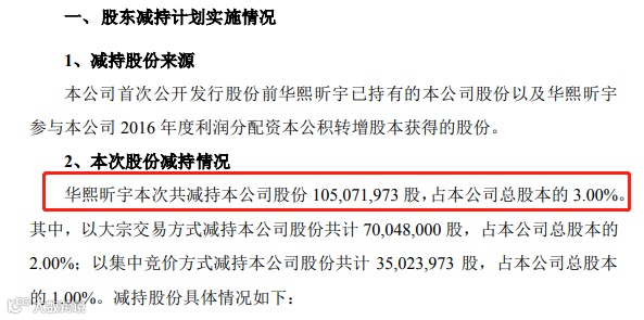 1月14日晚间,第一创业证券公布公告称,华熙昕宇本次减持计划已实施完成,按照原定计划共减持了1.05亿股公司股份,占总股本的3%,其中以大宗交易方式减持三分之二,以集中竞价方式减持三分之一。
