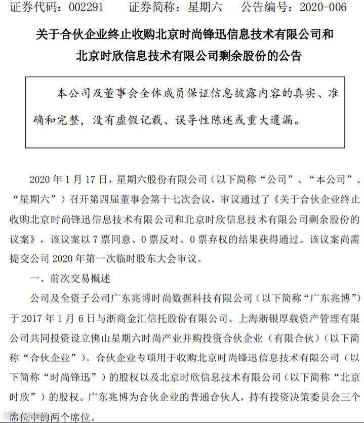 1月17日晚间,星期六公告称,合伙企业终止收购时尚锋迅17%剩余股份和北京时欣20%剩余股份的收购。合伙企业的LP之一浙商金汇信托股份有限公司未能按计划出资,使得合伙企业对北京时尚锋迅信息技术有限公司和北京时欣信息技术有限公司剩余股份的收购未能按期完成。因此,公司审慎决定终止合伙企业对相关剩余股份的收购。