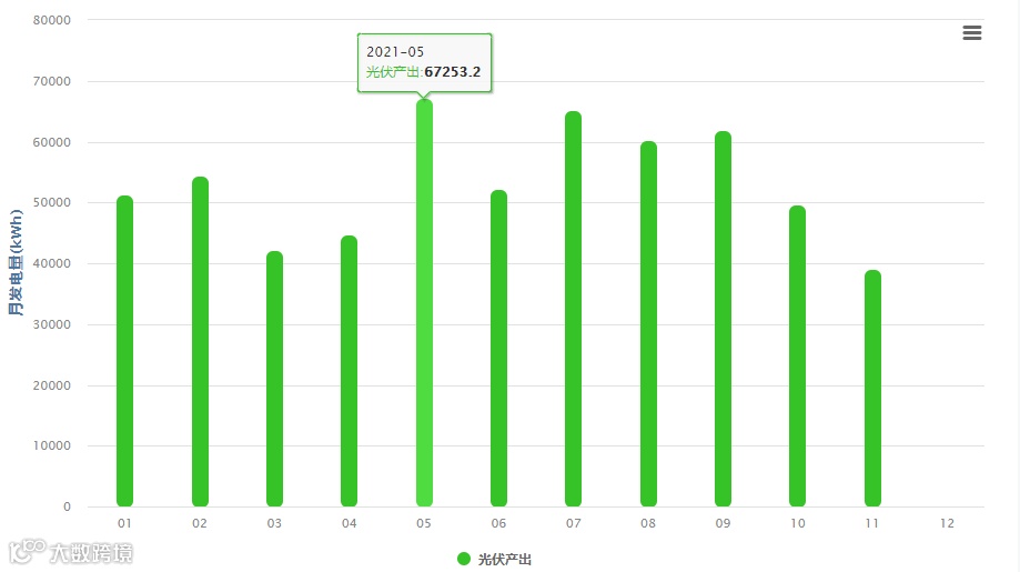 (表1 2021年1-11月发电量数据,11月未完全统计,5月为最高发电量,达67253.2kWh,预计全年发电量可达670000kWh)