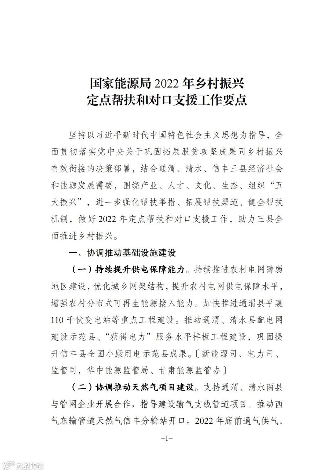 为做好2022年定点帮扶甘肃省通渭县、清水县和对口支援江西省信丰县工作,现印发《国家能源局2022年乡村振兴定点帮扶和对口支援工作要点》,请按照职责分工扎实推进落实。