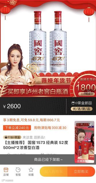除了贵州茅台,薇娅也直播买了泸州老窖的国窖1573,原价2600元2瓶,在其直播室1800元可得三瓶。