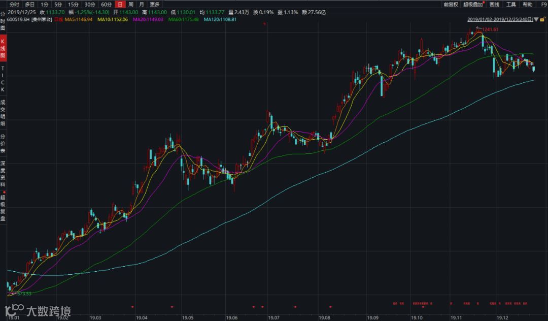 作为白酒行业当之无愧的行业老大,贵州茅台在2019年也曾经历艰难坎坷,多次迎接负面消息。但其股价却从不足600元一路走高,在上月攀至1241.61元/股的高价。以最新数据计算,贵州茅台年内市值飙升超过7000亿元。