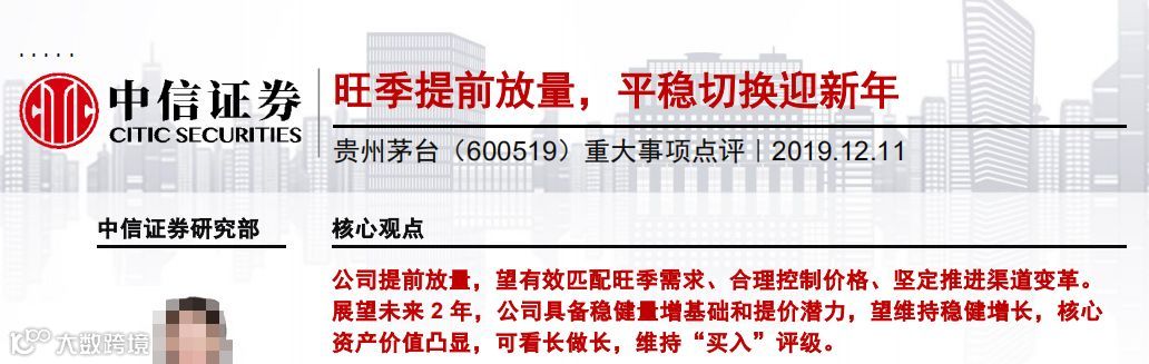 中金公司则指出,茅台仍然处于行业第一高端品牌,品牌价值仍有释放空间,消费群目前仍然非常小众,存在长期放量和提价空间,公司加大直供渠道开发也有意拓展大众消费群。当前中国白酒进一步向高端品牌升级,推动茅台需求逐步大众化茅台的品牌和产品优势可以推动公司进一步结构优化,打造高端消费群的奢侈品需求,产品结构也有较大提升空间。