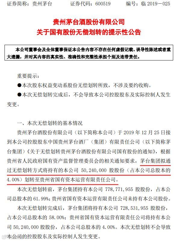 12月25日晚间,贵州茅台发布国有股份无偿划转公告。贵州茅台于25日接到控股股东茅台集团通知,根据贵州省国资委的相关通知要求,茅台集团拟通过无偿划转方式将持有的贵州茅台5024万股股份(占总股本的4.00%)划转至贵州国资公司。