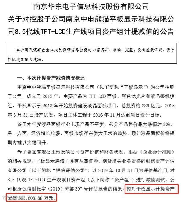 12月30日深夜,华东科技发布公告称,拟对控股子公司平板显示计提资产减值56.56亿元。