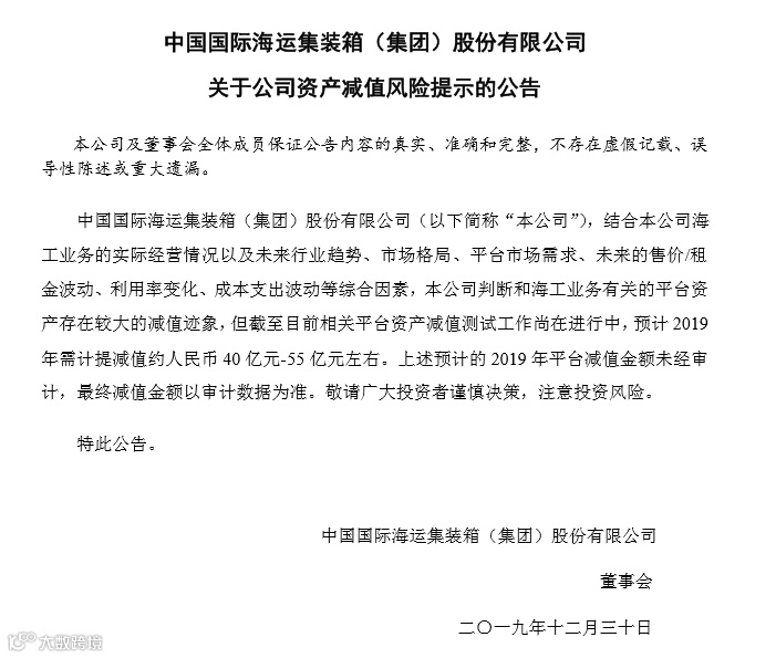 12月30日,中集集团发布公告称,该公司预计2019年需计提减值约40亿元-55亿元。