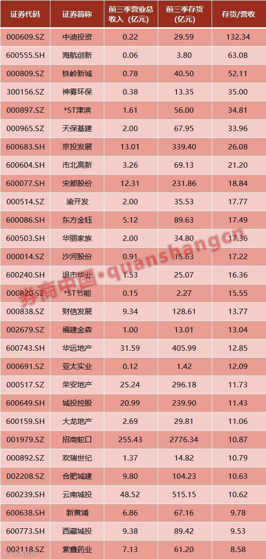 其次是存货占比较高的上市公司亦值得关注。在这里面,地产公司可能情况较为特殊,但非地产类企业若存货超过主营收入,那就需要好好研究一番。